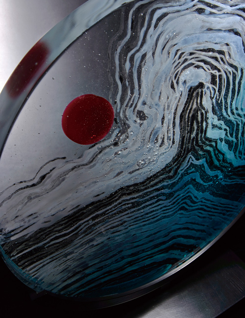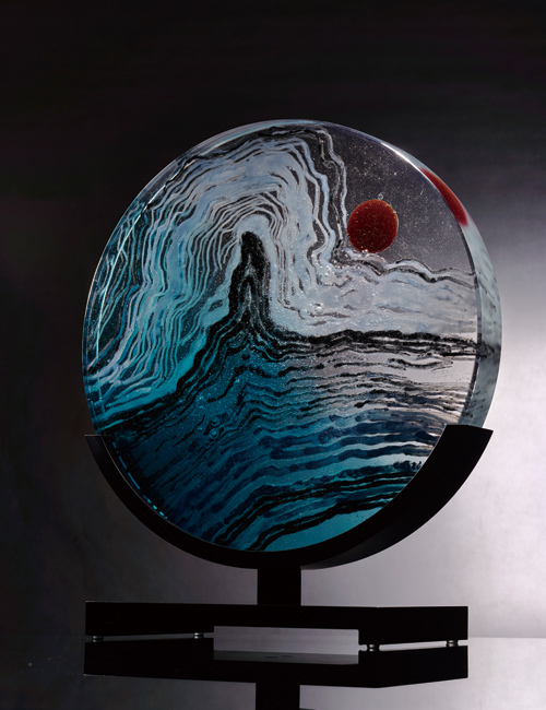 然而, 琉璃材质的发展,不止于此。《一抹红》将属于宋画的笔韵与色彩展现,同时将现代雕塑中的光线与时间引入,颠覆了平面绘画的概念,充满了4D空间的想象力。因为材质通透,釉料的渲染之中,宋人对于天地时序的勾勒,对于远近层次的描摹,就无比清晰的显露出来。这是水墨走向现代表述的过程里,最动人心魄的色彩。